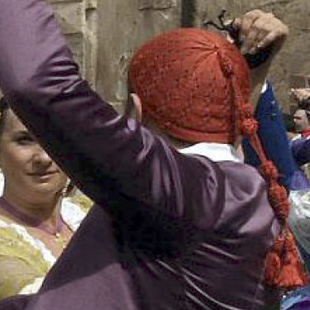 · La faixa, d’un color distint al de la jupa, però semblant al del barret d’alborços. Sense que asomen els serrells (flecos).