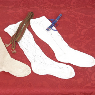 Calces blanques, de punt, fent dibuixos i calats, fins al genolls (mitges calces), molt semblant a les de l'home però més guarnides.