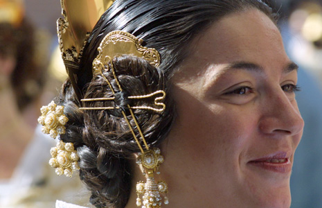 Cal dur el pentinat a tres bandes, amb tres ratlles per als tres monyos: el gran de darrere i els dos rodets damunt de les orelles. Les pintes seran de llautó (metàl·liques), daurades, amb dibuix o en relleu, de dissenys clàssics, tot intentant evitar les fantasies que han irromput en el món de les falles. En quant a la joieria o “adreç”, cal tindre en compte les arracades anomenades “gallegues”, “de a u”, “de fulla”, “de llaç “, “de a tres o de la verge”, de “barquillo”, “de raïm o molinera”, etc. i també la pedreria de color verd, cristall o espillets.